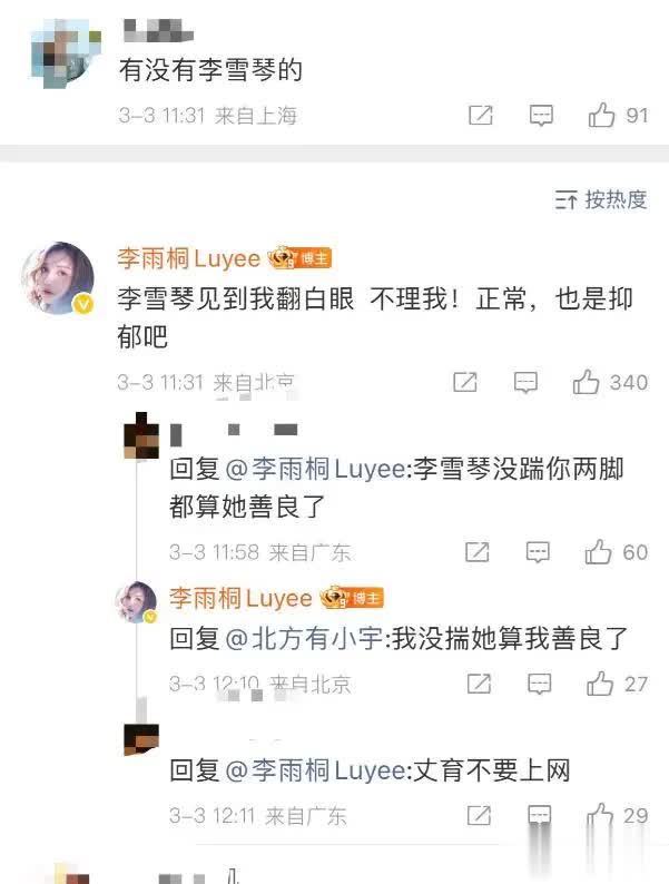 李雨桐还在账号的互动评论区顺带提到了李雪琴,称见到她会翻白眼。
