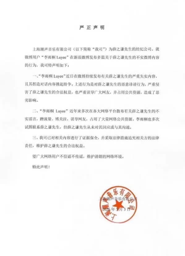 薛之谦本人一直未在社交媒体上公开表态,其公司发布了一份声明,宣布将对李雨桐提起诉讼。