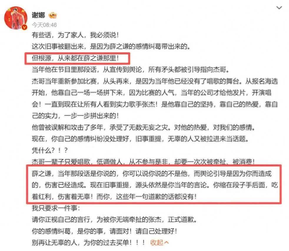 谢娜选择在公开平台发声,要求薛之谦正面回应,向张杰道歉。